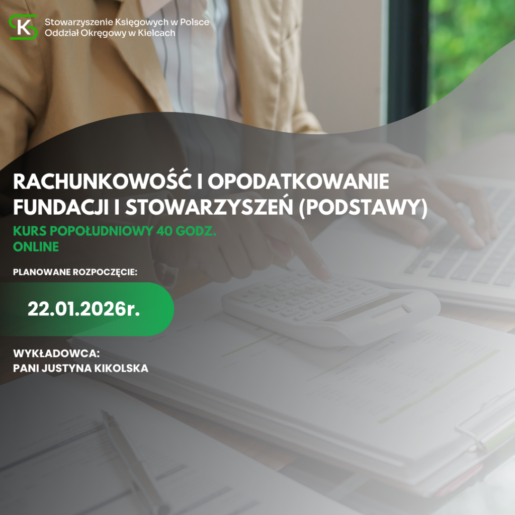 Prowadząca: Pani Justyna Kikolska - Absolwentka Wydziału Zarządzania Uniwersytetu Warszawskiego, magister z zakresu rachunkowości i finansów, posiada również certyfikat księgowy Ministerstwa Finansów. Doświadczony praktyk z wieloletnim stażem w księgowości i podatkach. Doświadczenie zawodowe z obszaru księgowości i podatków zdobywała w firmach branży handlowej, usługowej i produkcyjnej. Od 2007 roku zajmuje się również prowadzeniem ksiąg rachunkowych organizacji non profit. Od 2010 roku prowadzi własne biuro rachunkowe, w tym rozlicza organizacje non profit.