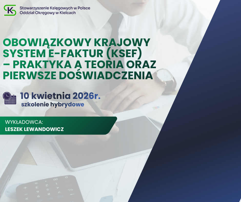 lub - stacjonarnie - sala wykładowa Oddziału Okręgowego Stowarzyszenia Księgowych w Kielcach, ul. Zagnańska 84a (IIIp.) - ZAPISY TUTAJ